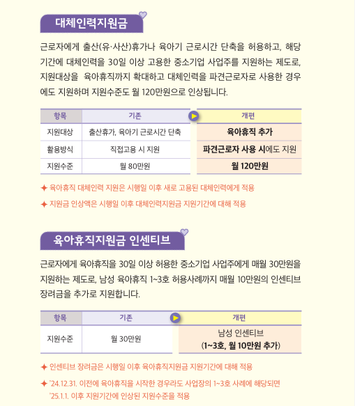 - 대체인력 지원금: 중소기업의 경우 육아휴직으로 인한 업무 공백을 메우기 위해 대체인력을 채용할 경우 월 120만 원을 지원합니다. (기존 80만 원에서 인상)