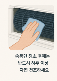 - 송풍팬 청소 후에는 반드시 하루 이상 자연 건조하세요.