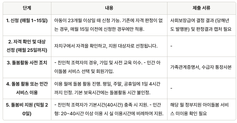 신청기간은 매달 1일부터 15일까지입니다. 이 기간 내에 신청서를 제출해야 하며, 아동이 23개월이 되는 시점부터 신청이 가능합니다. 따라서, 조부모가 손주를 돌보는 경우, 미리 신청을 준비하는 것이 중요합니다. 다만, 기존 정부 지원 아이돌봄 봄 서비스 자격 판정이 없는 경우, 매월 15일 전에 정부지원 아이돌봄서비스를 신청해야먄 해당 신청에 적용 처리가 가능합니다.